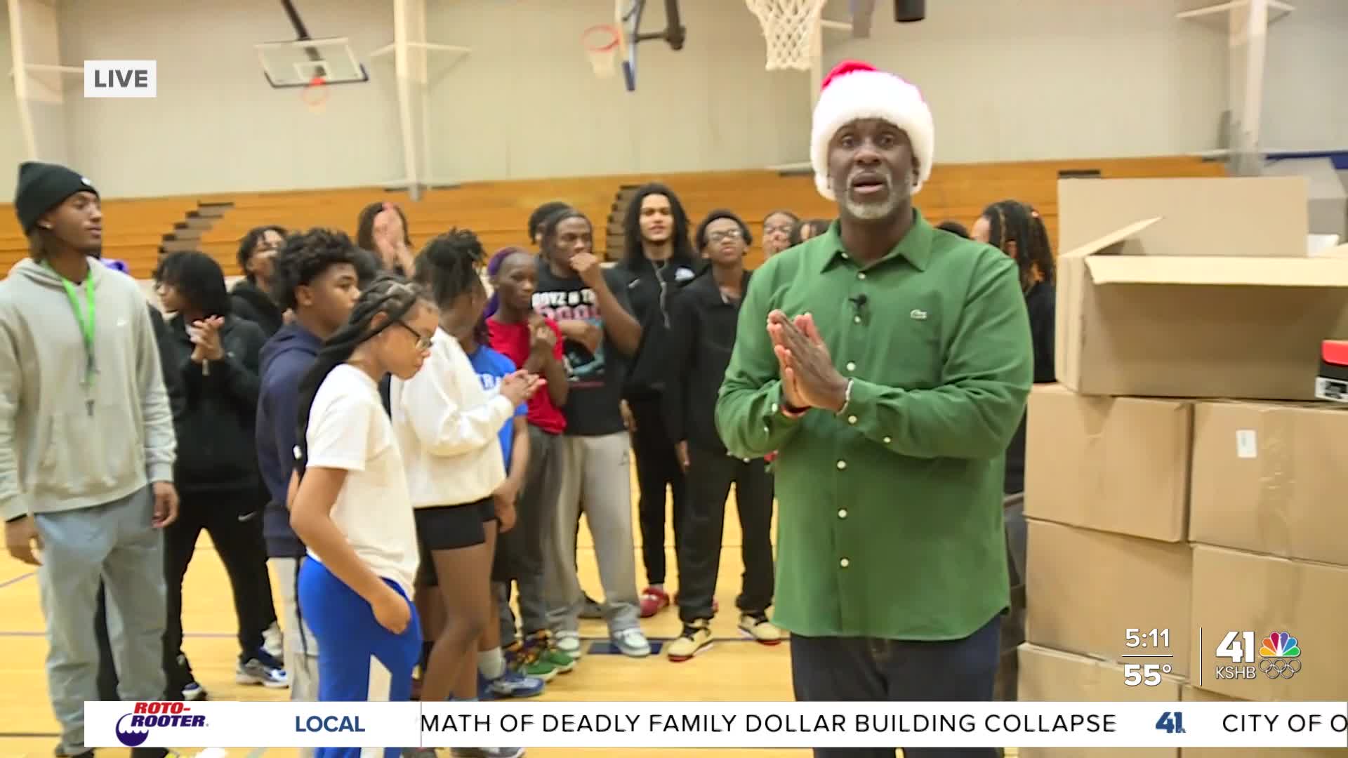 KSHB 41's Kevin Holmes distributes 'Gift of Sole' shoes at Central High School