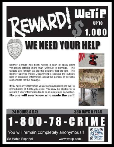 Bonner Springs Police are offering a $1,000 reward for information leading to a conviction. To leave an anonymous tip, call 1-800-78-CRIME.