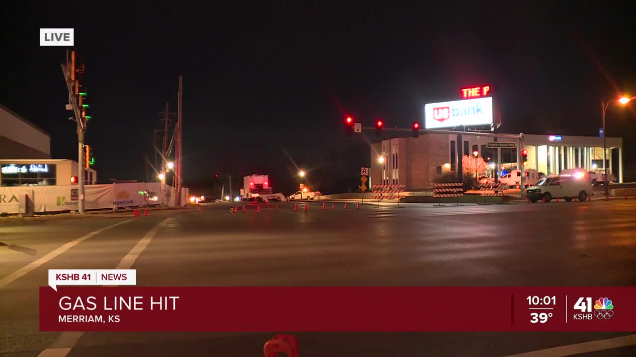 KANSAS CITY, Mo. — Kansas Gas Service crews stopped a gas leak Wednesday night in Merriam after a construction crew struck the line just after 5 p.m.