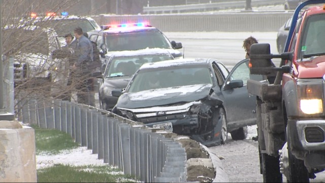 Road crews on both sides of the state line began treating roads by mid-morning, but agencies across the metro reported dozens of crashes and slide-offs throughout the day.