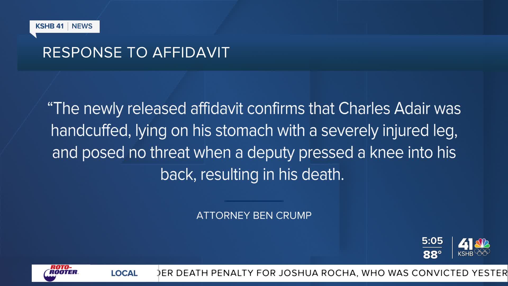 “The newly released affidavit confirms that Charles Adair was handcuffed, lying on his stomach with a severely injured leg, and posed no threat when a deputy pressed a knee into his back, resulting in his death," Crump and attorney Harry Daniels said in the statement. "We will continue advocating for Charles Adair, and his family, demanding full transparency and accountability. Those responsible must be held accountable, and justice must be served.”