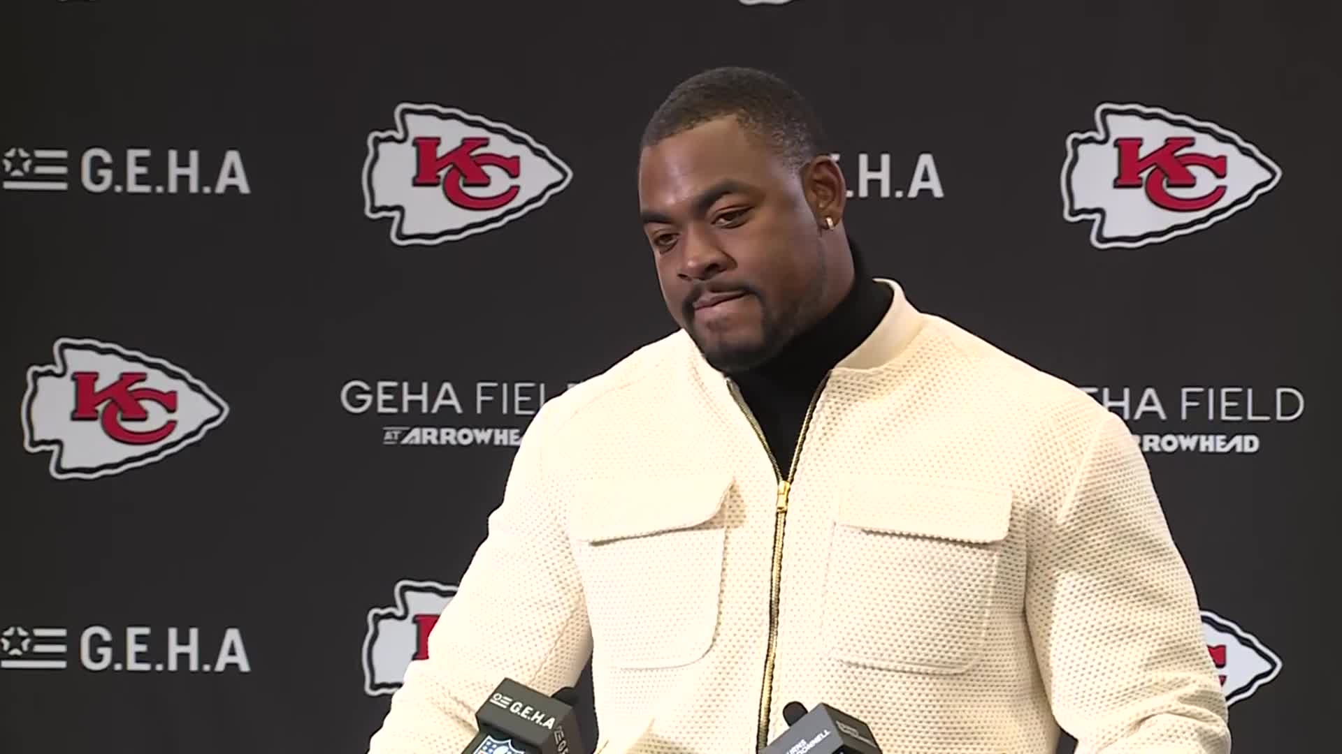 Jones appeared to be stretching his left leg flanked by a member of the Chiefs’ training staff.