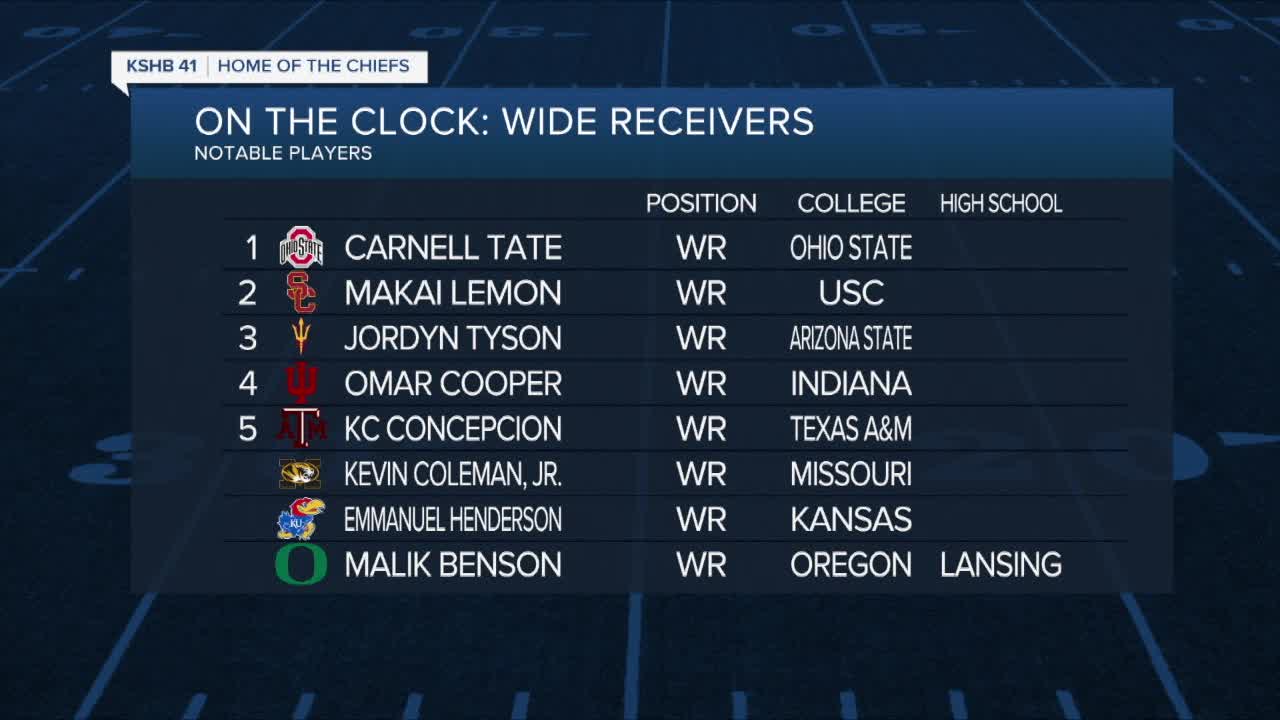 Ohio State wide receiver Carnell Tate is a top prospect at the position. Many mock drafts project the Chiefs will select Tate if they choose to stay at No. 9.