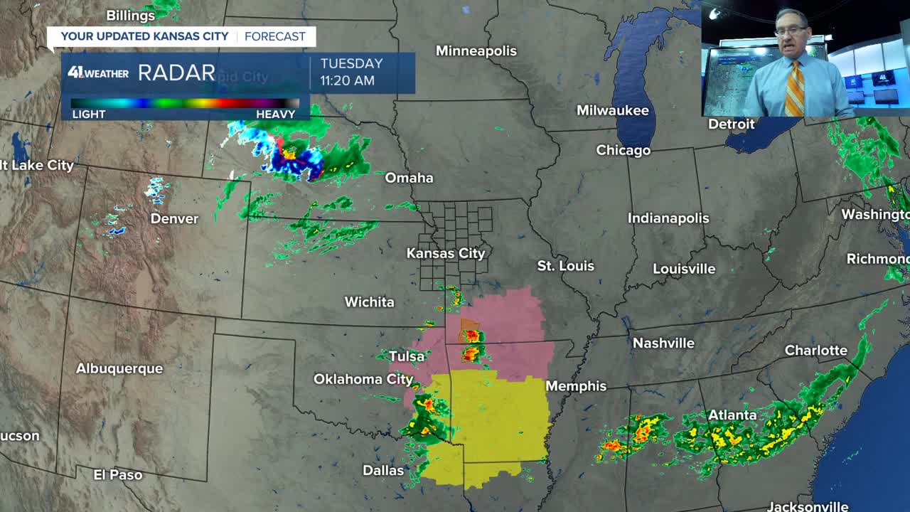 The biggest storms Tuesday are south of Kansas City, with the main severe threat being large hail. There has been tennis/softball ball-sized (3"-4" diameter) hail along and south of Interstate 44. A few smaller thunderstorms will cross Kansas City this afternoon, but don't be surprised if you see some smaller hail.