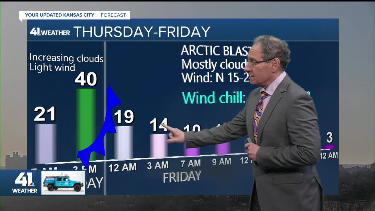 The Arctic air will arrive Thursday night, so we will see temperatures in the single digits all day with wind chill values -25° to -10°. Snow will start forming in western Kansas. Our area will be mostly dry.