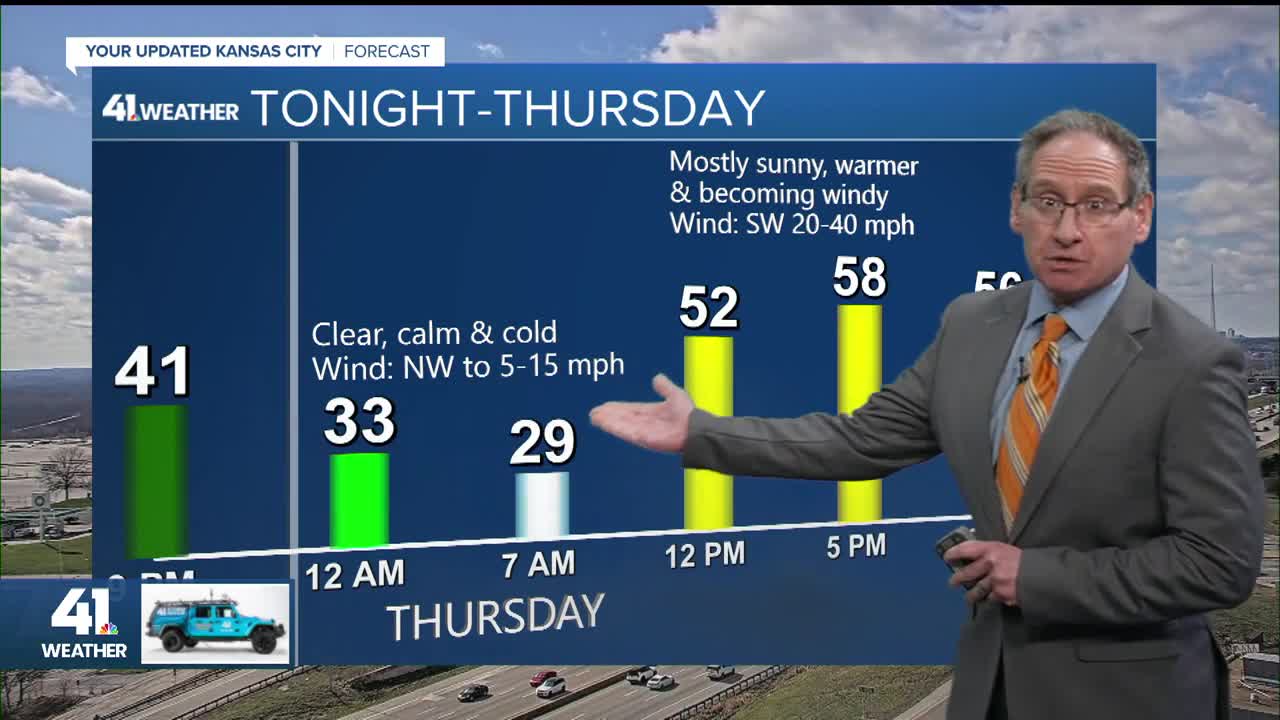 A warm front will move through with a few clouds. But, the wind will become southwest 20-40 mph during the day, lasting into the night. And in locations that have not see much rain, like northeast Kansas and northwest Missouri, there is a Fire Weather Watch. We will get close to 60°.