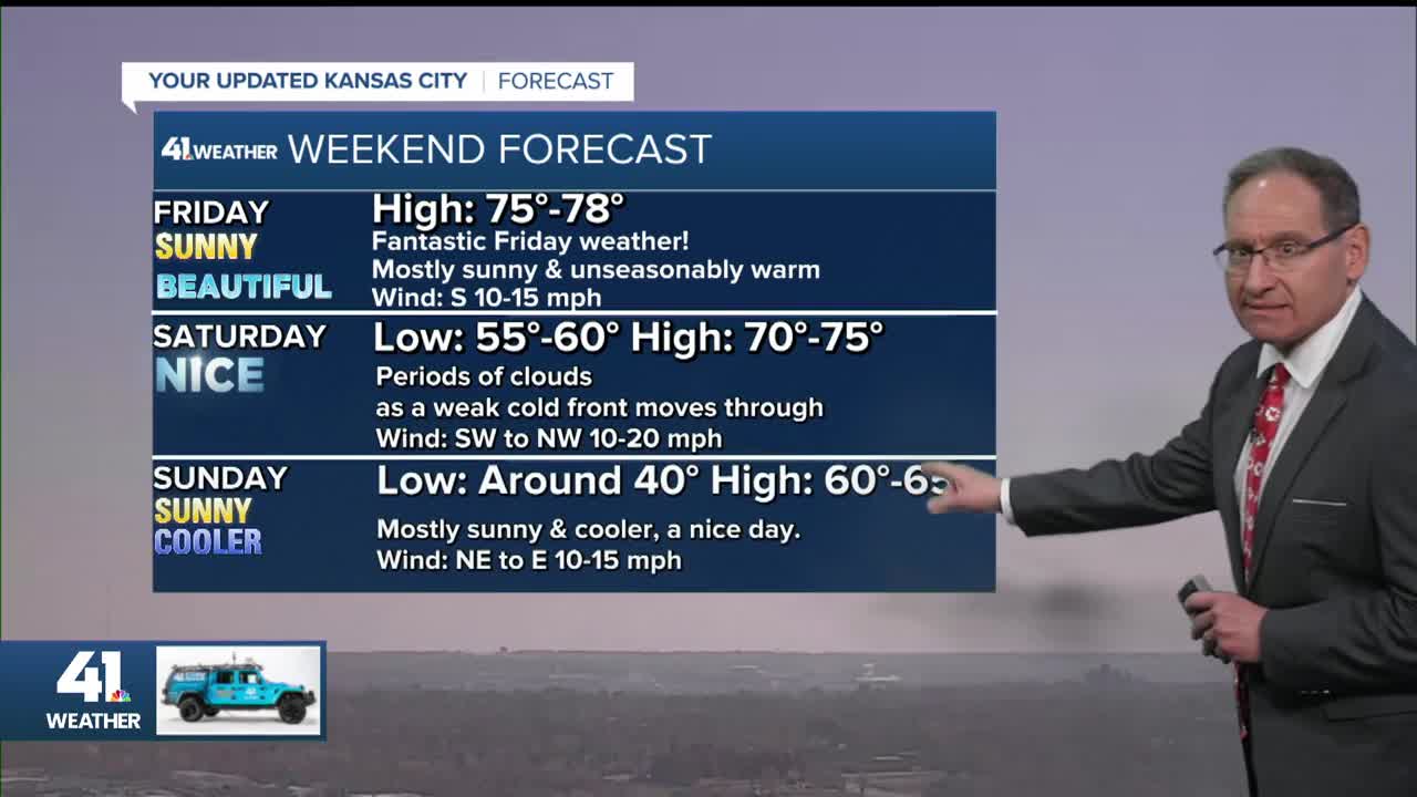 We will see another nice day, but cooler with highs in the low 60s. That is still 10 degrees above average. The weather in Denver for the basically "must-win" game for the Chiefs looks nice as well. It will be dry with temperatures dropping from the 60s to 50s for the 3:25 p.m. kickoff. The wind will be mostly light as well.