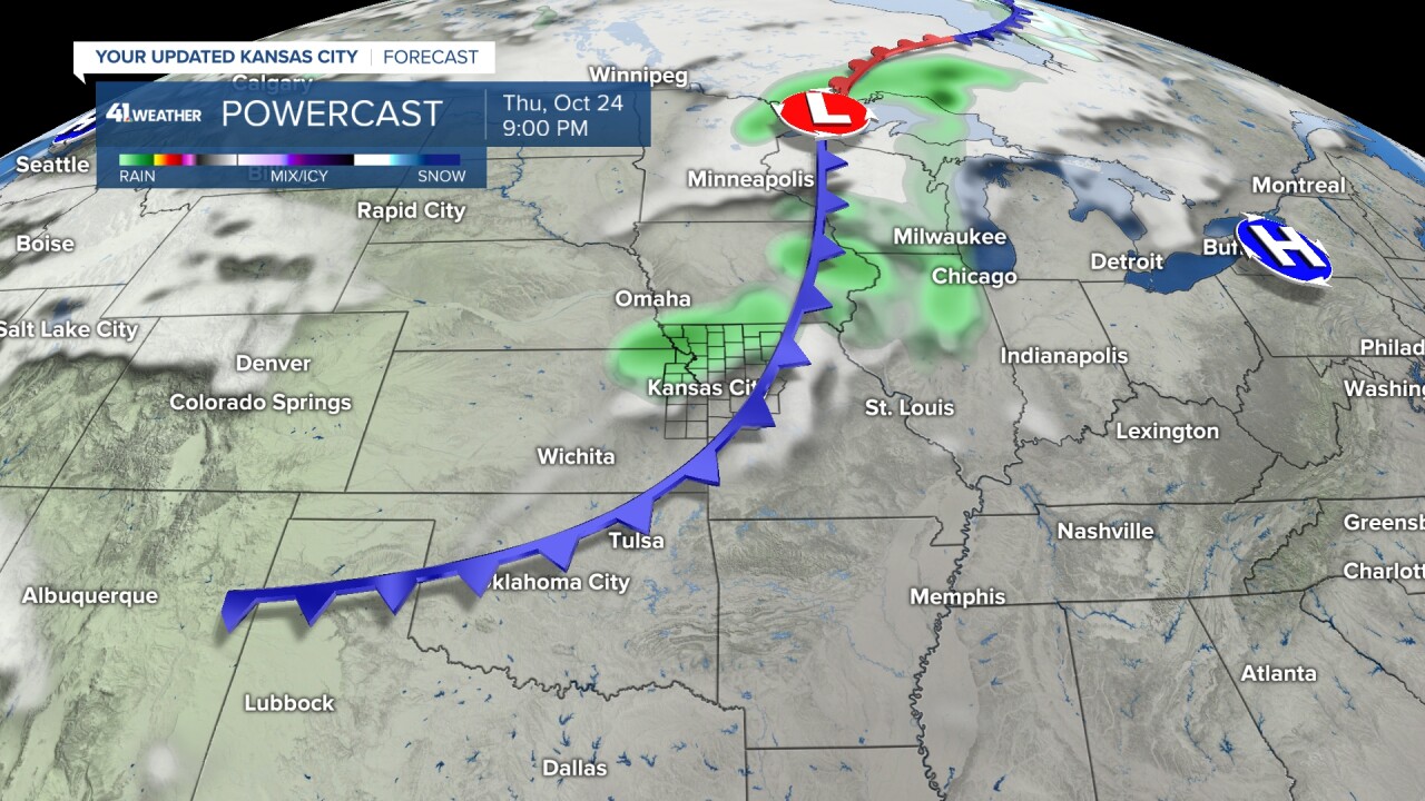 This system will slide through the upper Great Plains and drop a cold front through Kansas City Thursday night into Friday, bringing us cooler temperatures for the weekend but also maybe 0.10-0.25" of rain as well.