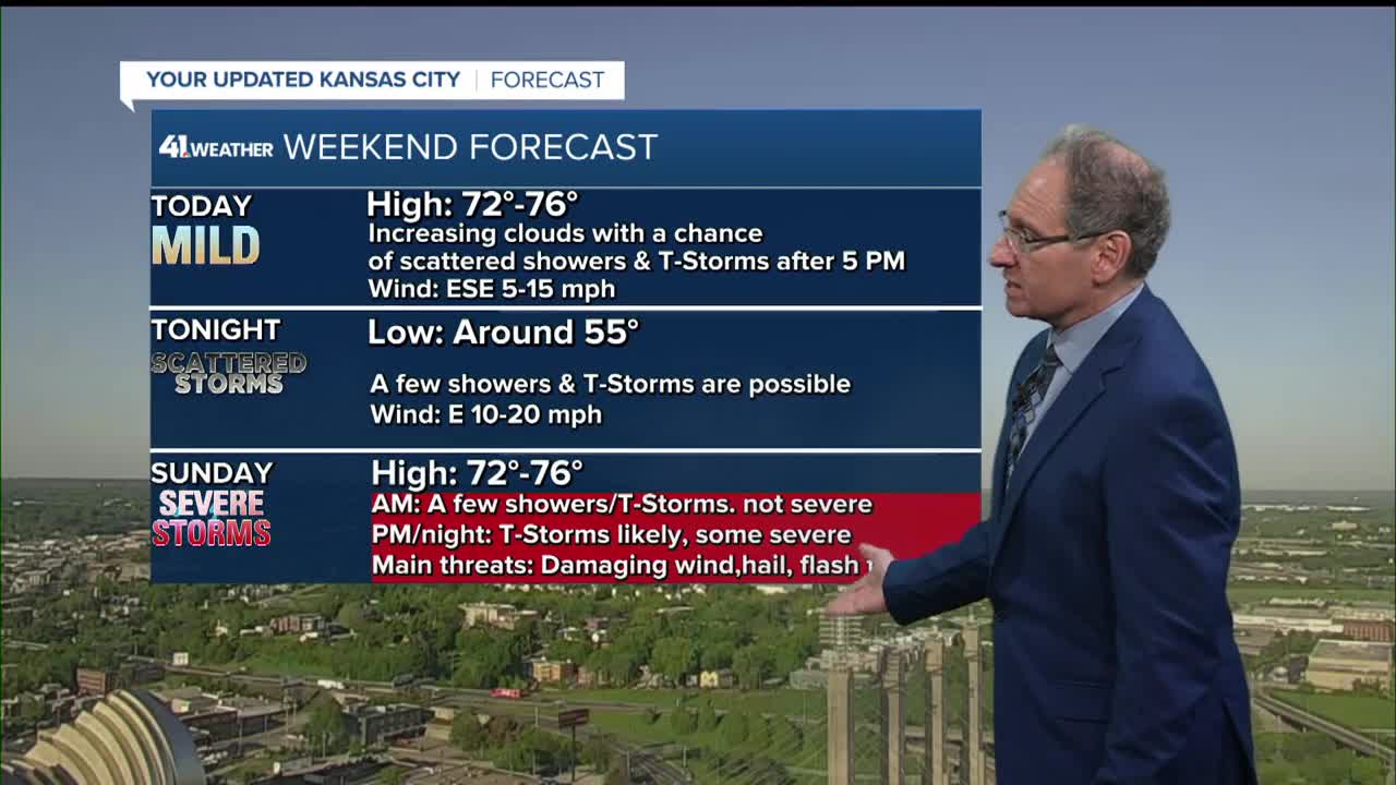 Sunday: A few showers and thunderstorms during the morning with little to no severe threat. Increasing chance of thunderstorms, some severe, later in the afternoon, evening and night.