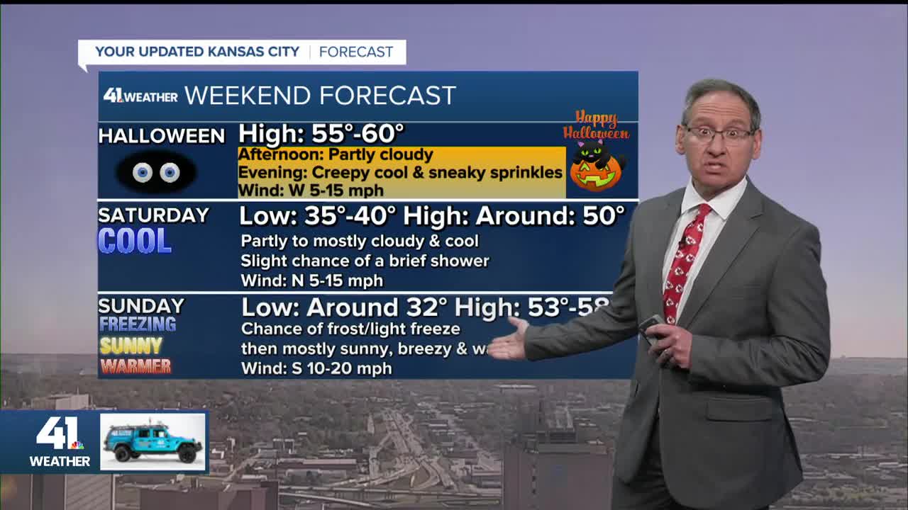 Tonight: Mostly cloudy & cool for trick or treating. There is a slight chance of a sprinkle/light shower mainly south & west of KC. After midnight it becomes partly cloudy.