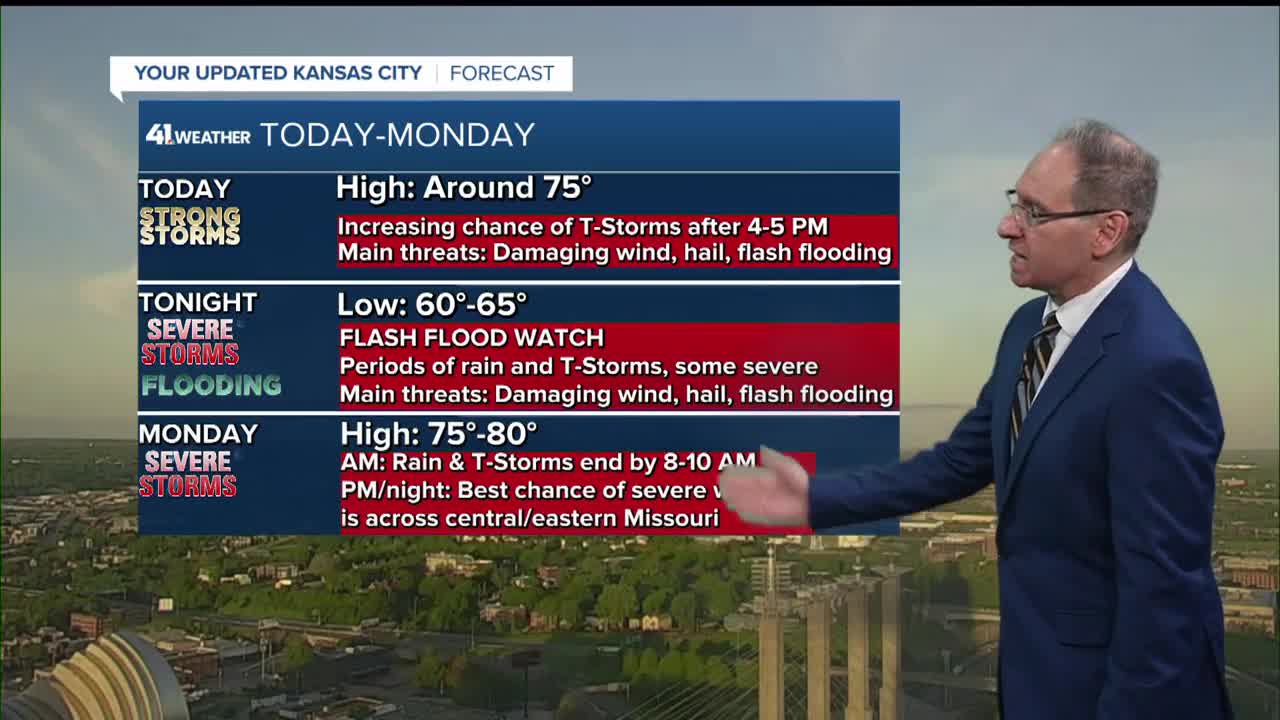 Sunday night: FLASH FLOOD WATCH. Periods of rain and thunderstorms, some may be severe. Damaging wind and hail are the main threats along with flash flooding.