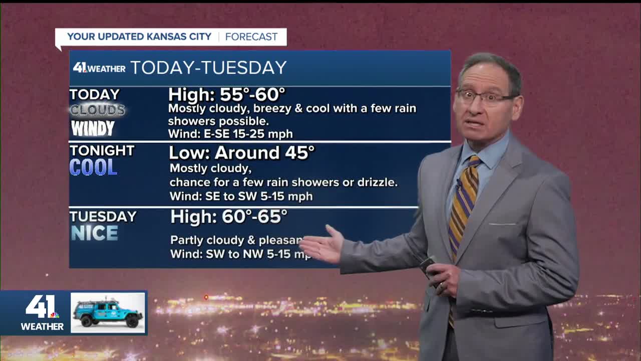 Monday: Mostly cloudy and breezy. A few showers may be around during midday. Some sun is possible late in the afternoon.