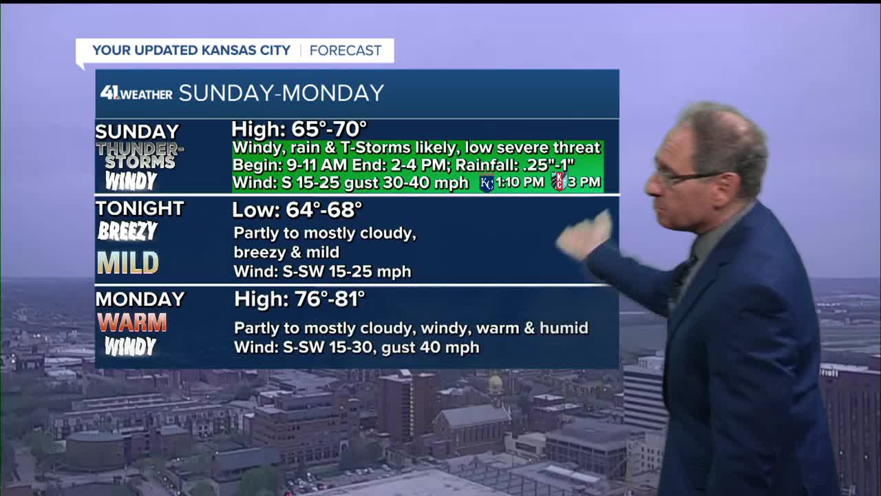 Sunday: Rain and thunderstorms move in 9-11 AM and end 2-4 PM. It will be windy, but there is little to no threat of severe weather.