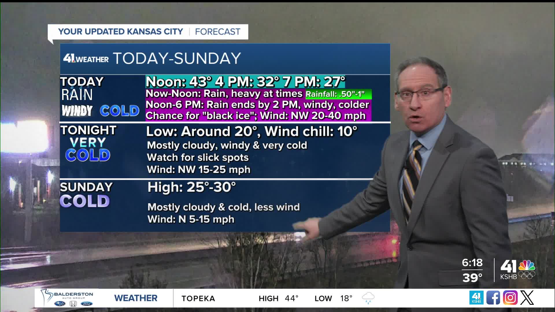 Saturday: Rain, heavy a times, this morning. The rain will end by 2 PM as much colder air rushes in on strong northwest winds. Any water left on surfaces may turn to "black ice."