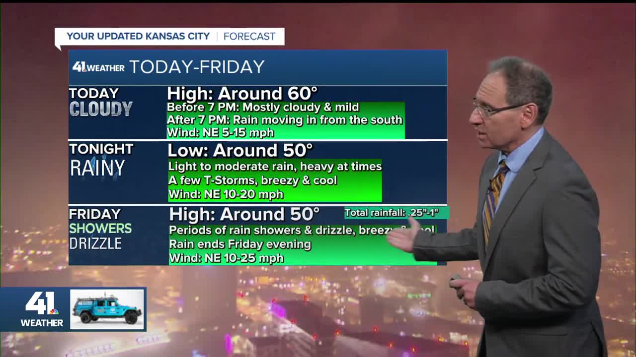 Friday: Steady temperatures near 50, chilly wind with occasional showers. Some heavy at times. The rain exits Friday evening.