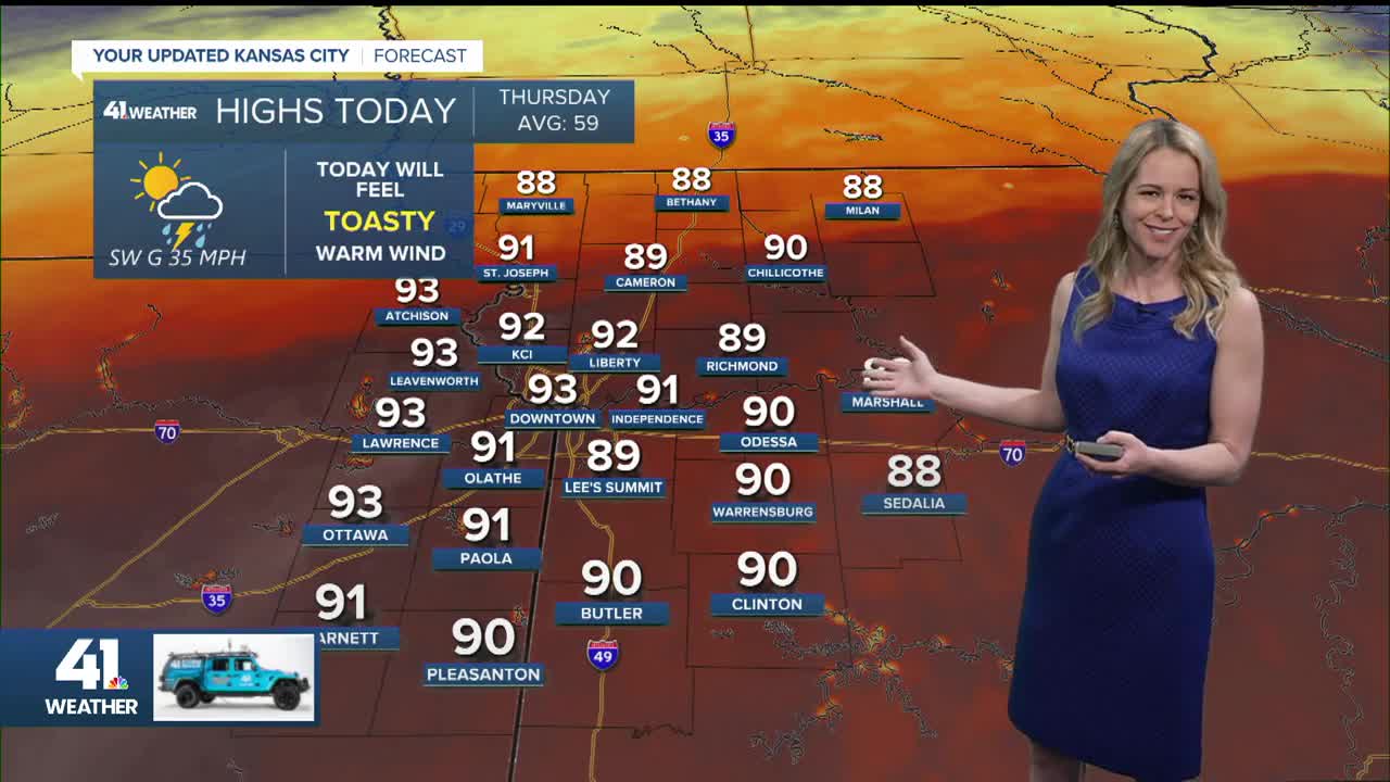 Thursday: Hot with just some afternoon passing clouds. Warm winds followed by shower and storm chances after 7pm. Some could have strong wind and hail, low severe risk.