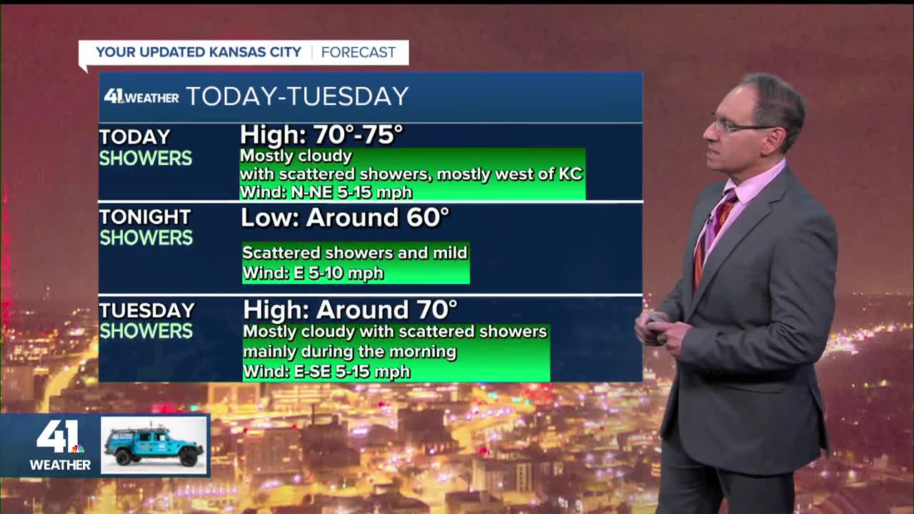 Tuesday: Mostly cloudy with scattered showers, mostly west of KC