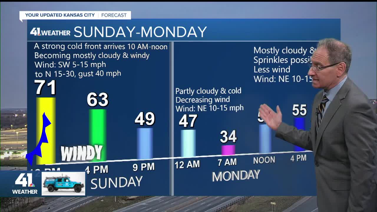 Sunday: A strong cold front will sweep across the region today, reaching KC around 10 AM. Temperatures will warm to the 70s/80s ahead of the front, warmest south of I-70. After the front moves by it will become windy & mostly cloudy with temperatures