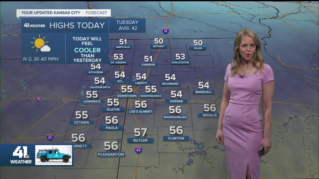 Tuesday: Partly to mostly sunny and much cooler with a brisk northerly wind.