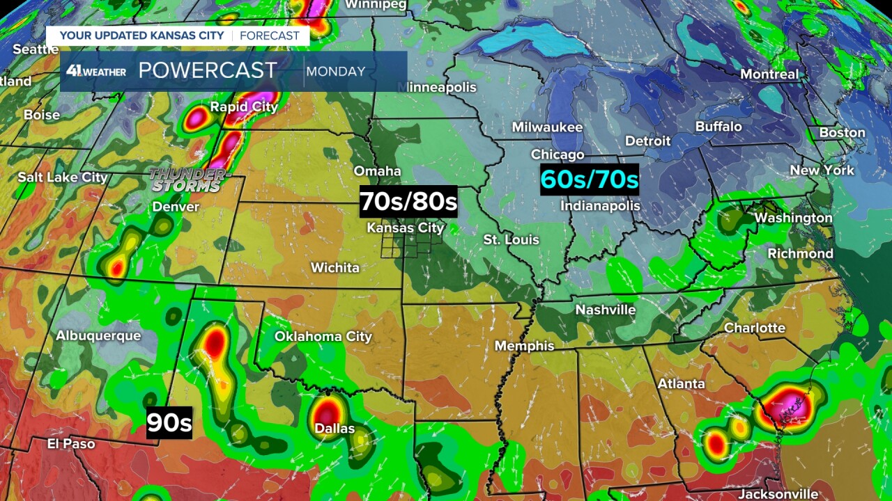 Systems will bring thunderstorms to the southern Plains and upper Midwest. We are in between the two systems, which means we will see some clouds and perhaps a sprinkle, but we are leaving the forecast dry.